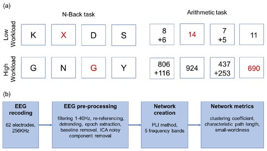 In this study, two working memory (WM) cognitive tasks, n-back and mental arithmetic with two levels of complexity, low- and high-workload levels) were used (Figure 1a). The E-Prime 2.0 software (Psychology Software Tools Inc., Pittsburgh, Pennsylvania, USA) was used for stimulus presentation. The two tasks were performed two times each with random order. A button was required to be pressed for both target and non-target stimuli, while no feedback was provided.