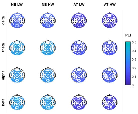 In Figure 2, the 100 edges with highest PLI value are shown on scalp maps for each task, workload condition and frequency band. Most of the connections are located in parietal–occipital areas as well as in frontal areas, while few connections are present in central and temporal areas. Of note, the interactions are about equally distributed across the two hemispheres.