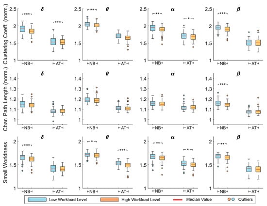 Statistical analysis was performed via a repeated-measures two-way ANOVA to assess the workload effects on brain network reorganization. The AUC of each metric over sparsity level was calculated and was used for statistical analysis for all participants together. Data were normally distributed according to Shapiro–Wilk test (p > 0.05). Given that our primary objective was to reveal task-independent mental workload influence on brain activities, we focus mainly on the workload effects (Table 1). Specifically, for the clustering coefficient, a significant workload effect was found for all frequency bands (p < 0.05) and the post-hoc paired t-test revealed significant decrement for all bands for the n-back task (p < 0.05) and in θ and α for the mental arithmetic (p < 0.05). For the characteristic path length, a significant workload effect (F1,316 = 4.50, p = 0.04) as well as significant interaction of task and workload factors (F1,316 = 4.75, p = 0.03) were detected in β band, although the t-test analysis presented significant decrement only for the n-back task (t79 = 3.20, p = 0.002). Finally, the small-worldness metric displayed significant workload effects in θ (F1,316 = 8.61, p = 0.004) and α bands (F1,316 = 7.69, p = 0.006), with the post-hoc analysis further confirming the significant decrement for both tasks (p < 0.05). In all statistically significant cases, a common trend was observed—i.e., a decrement of the network metric values—revealing the way of brain network reconfiguration with the increase in workload levels.