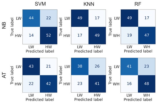 Since the metrics showed high capabilities of separating mental workload, they were used as classification features. Indeed, satisfactory classification performance was achieved (Table 2). Best performance was obtained by the RF algorithm for the n-back task (75%) and KNN for the arithmetic task (70%). The confusion matrices are displayed in Figure 4. We observe that the falsely classified instances are equally distributed between the two classes, indicating no bias towards a specific class.