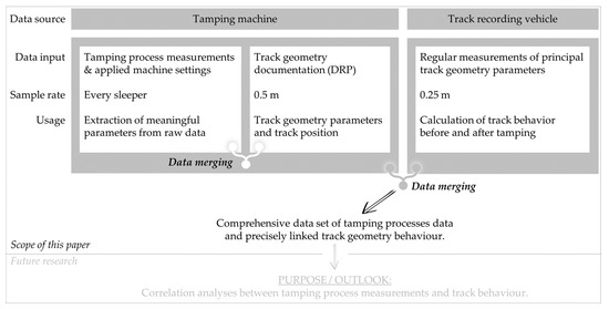 This paper presents a methodology aimed at combining tamping machine data and track geometry data. The developed method provides the groundwork to correlate tamping process measurements and track behaviour for the first time. The result of the data preparation, data synchronisation, and data merging process described in Section 4 is a comprehensive data base which contains all required information for our intended investigations. It is planned to convert selected tamping machine measurement parameters—dynamic forces in the tamping tines, squeezing and compaction energy, squeezing movement (squeezing distance, centre of gravity of the squeezing distance)—into a “squeezing index”, which can be interpreted as a ballast compaction indicator.