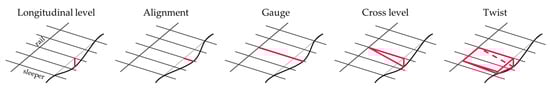Railway tracks need to be regularly monitored and inspected in accordance with legal standards (e.g., European Standards) and inspection plans of the infrastructure manager. The particular focus of the monitoring process lies on the principal parameters of the track geometry, as defined in the European Standard EN 13848-1 [12]: Longitudinal level, alignment, gauge, cross level, and twist (illustrated in Figure 2). Longitudinal level and alignment represent the unevenness of each rail in the vertical and horizontal plane, expressed via three wavelength ranges D1 (3–25 m), D2 (25–70 m), and D3 (longitudinal level: 70–150 m, alignment: 70–200 m). Optionally, short waves (D0: 1–5 m) may also be evaluated, as these are attributed to creating high dynamic loads. Gauge is defined as the shortest distance between both rails, measured 14 mm below the rail heads. Cross level is the relative vertical position of the two rails, while twist expresses the change of the cross level over a defined distance.
