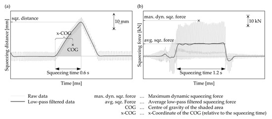 (a) Raw measurements and low-pass filtered data of the squeezing distance and (b) squeezing force and calculated parameters; the data originate from two different squeezing processes.