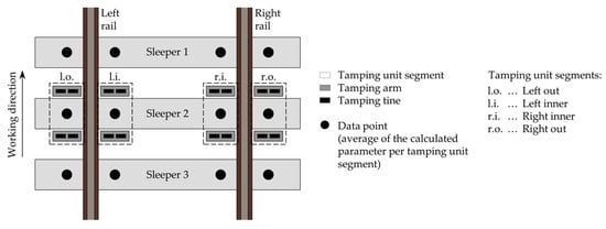 In a next step, the calculated parameters are checked for outliers; these may either originate from measurement errors or from inconsistencies during the tamping process (e.g., if the tamping unit is not positioned perfectly central above the sleeper and a tamping arm is consequently blocked by the sleeper). An algorithm developed for this purpose spans a moving window over three consecutive sleepers, thus covering twelve data points. If an individual data point of the middle sleeper (Sleeper 2 in Figure 7) deviates excessively from the median (the cut-off level is set at 0–2.5 times the median) of all twelve data points, it is removed. This procedure ensures that only values which approximately match their surrounding values are deemed reliable and used in further analyses. The arguably large, tolerated range of 0–2.5 times the median is necessary as even the averaged values may scatter considerably, depending on the local track condition.
