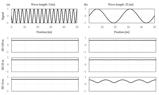 (a) Three metre sine wave and (b) 25 m sine wave and respective standard deviations with influence lengths of 100, 25, and 10 m.