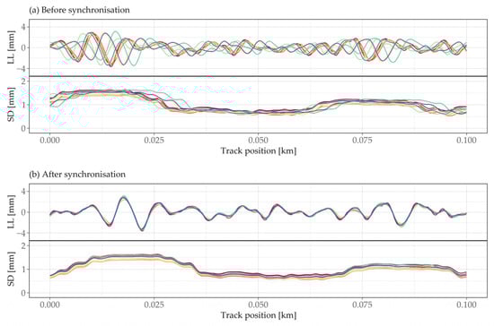 Longitudinal level (LL) D1 signals and standard deviations (SD) calculated with a moving window over 25 m; (a) before, (b) after the synchronisation process. Each colour represents an individual measurement run.