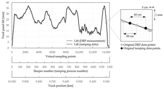 The tamping machine measurements are recorded at every sleeper, which are generally spaced at intervals of 0.6 m. These data points need to be allocated to the precise location on the track, which is a precondition for reliable correlation analyses between tamping data and track behaviour. This mapping is achieved in a two-stage process: (i) First, the taming data is merged with the tamping machine’s internal measuring system for track geometry documentation (“DRP”; data recording processor). A DRP file includes the track position, the displacement of the track panel (lifting and shifting), and a control measurement of the established track geometry at a sampling rate of 0.5 m. The lift of the track panel is a parameter that is recorded by both the experimental measurement setup at the tamping unit and the DRP, hence, the lift can be used to synchronise these two data arrays. Due to the different sample rates of 0.6 m (tamping data) and 0.5 m (DRP) it is necessary to insert a common “virtual” sampling rate. This is achieved by adding virtual measurement points (e.g., every five centimetres) and linearly interpolating missing values between the original data points. Having established a common sampling rate, the lifting values of the tamping data file can be synchronised with the lifting values of the DRP file (Figure 10). Similar to Fellinger’s synchronisation algorithm described above, one parameter is fixed and the other is shifting until the Euclidian distance between both curves reaches a minimum. As the DRP file includes the track position at every sampling point, the sleeper-specific tamping data are then also linked to the precise location on the track where the individual tamping processes were conducted.