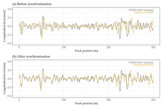 Merging tamping data and track geometry data by means of longitudinal level measurements; (a) before, (b) after the synchronisation process.