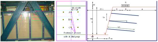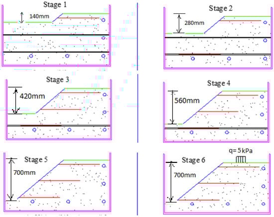 The laboratory model of the soil-nailing process (total soil slope model with a length of 1760 mm and a height of 850 mm) was completed in nine sequential stages [36], as follows (Figure 1).