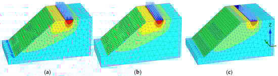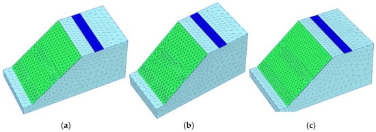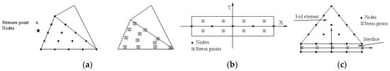 Each interface element has assigned a “virtual thickness”, which is an imaginary dimension used to define the material properties of the interface. The virtual thickness is calculated as the virtual thickness factor times the average element size. The average element size is determined by the global coarseness setting for the two-dimensional mesh generation. The default value of the virtual thickness factor is 0.1. A total of 5 stress points are used for a 10-node interface element, as shown in Figure 3c. Damians et al. [37] have studied the effect of interface element parameters, the element sizes and shapes at the interfaces on the reinforced soil structure analysis results, and they found that interface element parameters influence the results.