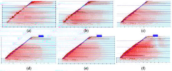 Horizontal displacement of the nailed-soil system during the construction and overburden pressure stages. (a) Construction stage 1. (b) Construction stage 3. (c) Construction stage 5. (d) Overburden pressure stage 6. (e) Overburden pressure stage 7. (f) Overburden pressure stage 9.