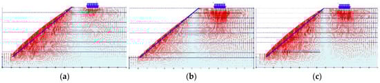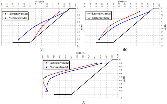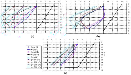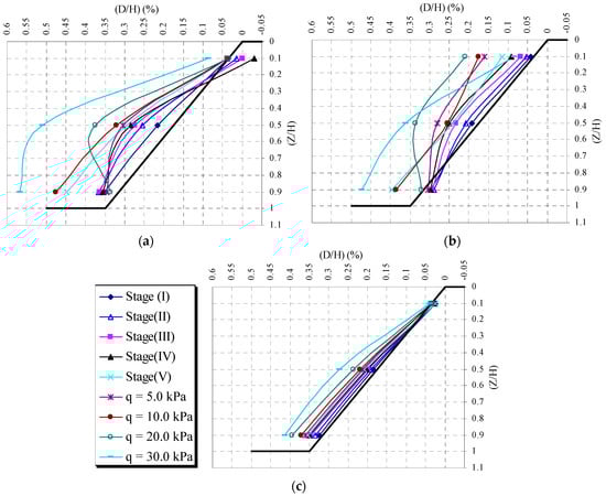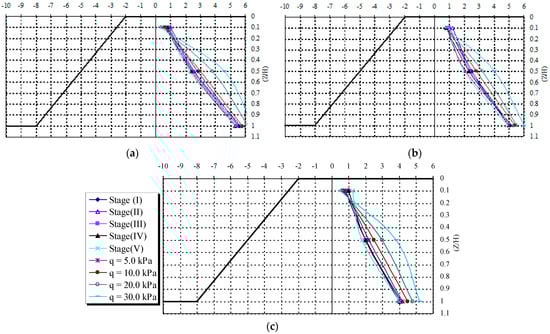 Horizontal displacements of the slope face with various soil densities. (a) Loose sand. (b) Medium dense sand. (c) Dense sand.