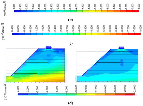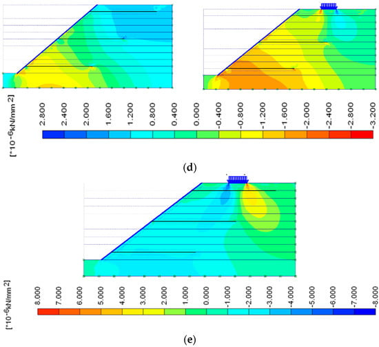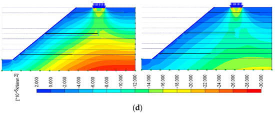 Horizontal stresses during the construction and overburden pressure stages. (a) Construction stage 1. (b) Construction stage 5. (c) Overburden pressure stage 6. (d) Overburden pressure stage 9.