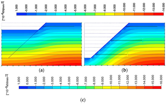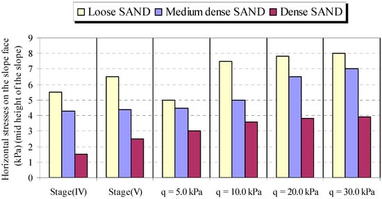 Horizontal stresses at the slope face with various soil densities. (a) Loose sand. (b) Medium dense sand. (c) Dense sand.