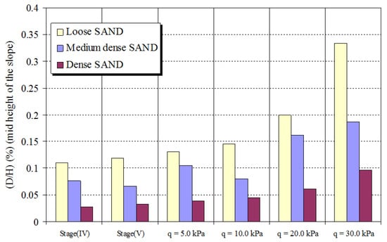 Figure 13 presents the vertical settlements of the foundation for various soil densities at different footing loads. The increase in the soil relative density decreases the footing vertical settlement. This decrease of the settlement could be attributed to the decrease of the slope face displacement. Moreover, the increase in the soil relative density is accompanied by a rise of shearing resistance, and, thus, reduction of vertical settlement of the footing. The reduction in footing vertical settlement ranged from 28.39% to 52.65%. It can be observed from the footing settlement’s variation that a greater reduction of the settlements with higher soil density is found at higher footing pressure.