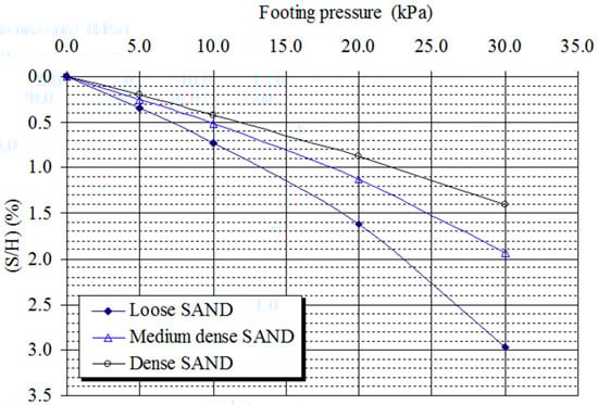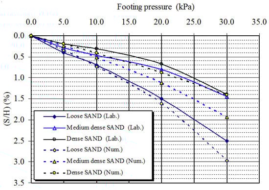 Figure 22 shows foundation vertical settlements (S/H, %) at different soil densities for both laboratory and FE models, (laboratory model results are drawn in solid lines, while the dotted lines represent the FE model results) [33]. It can be seen from the figure that the maximum footing settlement occurred at an overburden pressure of 30 kN/m2. It can be observed from the graph that the FE models overestimate the footing settlements. The variation in observed and computed settlement ranges from 4.4% to 18.7 in the case of loose dense sand, whereas it ranges from 13.4% to 40.6% and from 0.4% to 35.0% in the cases of medium and dense sand, respectively.