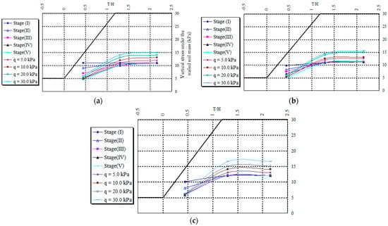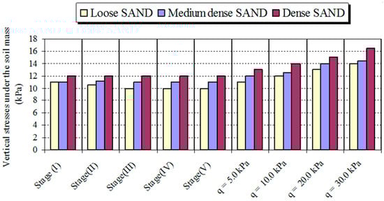 Vertical stresses under the soil mass with various soil densities. (a) Loose sand. (b) Medium dense sand. (c) Dense sand.