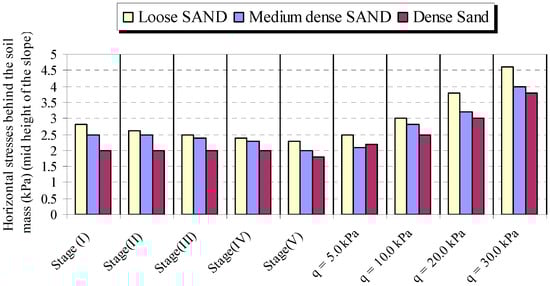 Figure 14 and Figure 15 present the influence of soil density on the horizontal stresses at the face of the slope at construction and overburden pressure stages. It is observed from the figures that decreasing relative density of the sand leads to increasing the horizontal stresses on the face of the slope, and stress enlargement ratio ranged from 12.50% to 61.54% for the soil type changing from dense sand to loose sand. It is observed from the graphs of variation of horizontal stress on the slope face developed in different densities of nailed-soil slopes that, when the overburden pressure is applied (stage 6) after construction of the slope, the horizontal stress decreases in the loose sand slope and increases in the dense sand slope, while it has no effect on the horizontal stress of the medium dense sand slope with the increase of soil density.