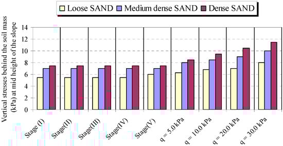 Figure 16 and Figure 17 present the influence of soil density on the vertical stresses under the nailed-soil mass at construction and overburden pressure stages. It is inferred from the plots that the influence of soil relative density on vertical stresses under the nailed-soil mass is directly related, i.e., the higher the soil density, the larger the vertical stresses under the soil mass. Increasing the relative density of the sand results in a rise of the vertical stresses under the nailed-soil mass up to 20.0% for the considered soil types. It is observed from the graph of vertical stresses under the nailed-soil mass with varying density that, when compared to construction stages, overburden pressure stages exhibit a higher increase in vertical stress with the increase in soil density.