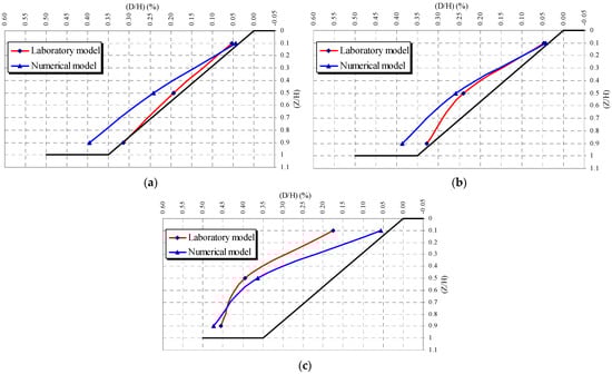 Horizontal movement of the slope from the laboratory and FE model (loose sand). (a) Construction stage 5. (b) Overburden pressure stage 6. (c) Overburden pressure stage 9.