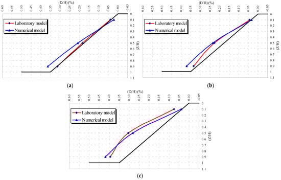 Horizontal movement of the slope from the laboratory and FE model (medium sand). (a) Construction stage 5. (b) Overburden pressure stage 6. (c) Overburden pressure stage 9.