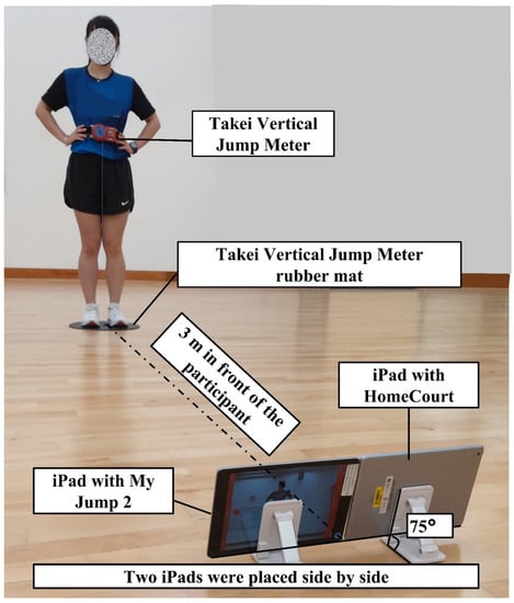 The two iPads (6th generation, iOS 14.4), one with My Jump 2 and another one with HomeCourt and the TVJM, were used to assess jump height. The jumping height (cm) of each jump was recorded and used for data analysis. Participants stood on the TVJM’s rubber mat with the belt around their waist and hands on their hips. Two iPad devices were placed on two foldable tablet stands without protective cases and were placed three meters in front of the participant side by side (Figure 2). The foldable tablet stands were set with a standardized angle of elevation at 75° in order to capture the entire body during the jumps using both mobile applications. This equipment setup was determined by the researchers to minimize measurement error.