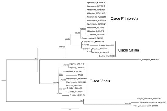 Maximum likelihood (ML) and Bayesian phylogenetic consensus tree where the TAV01 appears in a cluster together with Dunaliella viridis, D. polymorpha and D. parva ITS1-5.8S-ITS2 sequences. The latter sequence cluster was named as “Clade Viridis”. Other sequences clustered together into two major clades: “Clade Salina” and “Clade Primolecta”, which seem to be sister clades of each other. ML and Bayesian branch support values are given on the left (≥0.43) and on the right (≥63%), respectively. Lower support values were omitted.