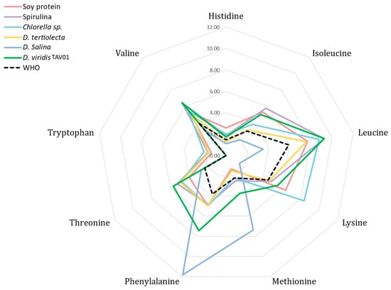 Transforming the data into a radial chart (Figure 4), it can be seen that the Chlorella sp. is the largest lysine producer, whereas D. salina showed the highest phenylalanine contents. Nevertheless, the total EAA content of D. viridis TAV01 was 65% higher than the minimum amount recommended by the World Health Organization (WHO): 27.1 g 100 g−1 []. Also, spirulina [], one of the algae displaying consistently high protein contents, shows lower EAA values (42.51 g 100 g−1) than those of D. viridis TAV01 (44.88 g 100 g−1). Furthermore, when compared to those of D. tertiolecta (34.78 g 100 g−1) [], D. salina (33.05 g 100 g−1) [], Chlorella sp. (42.60 g 100 g−1) [], or soy protein (39.00 g 100 g−1), TAV01 shows a better EAA value []. In addition, all individual EAA contents in TAV01 were equally higher, with threonine and phenylalanine being 2.47- and 1.95-fold higher than WHO requirements, respectively, and leucine, isoleucine, and valine about 1.6-fold higher than the required level, confirming that this strain has a high-quality protein profile, which might be excellent for human consumption. Moreover, the levels of several EEAs, such as valine, methionine, threonine, and isoleucine match human nutritional needs.