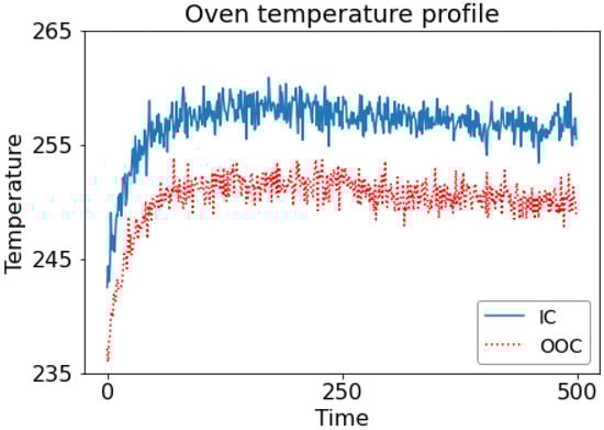Oven temperature profile studied by Jensen et al. [2]. The blue line represents the in-control (IC) profile and the red line represents the out-of-control (OOC) profile.