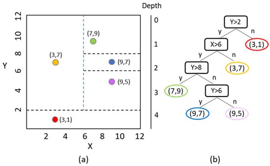 Concept of an isolation tree: (a) data points and isolation operations; (b) binary tree and the isolated point.