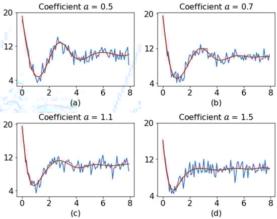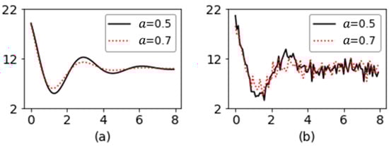 To assess the performance of the proposed method, its performance was compared with those of other methods through simulation. Before moving to the presentation of the results, we describe the choices of parameters of different methods used in this study. The splrep() function from the Scipy library [51] was used to find the B-spline representation of the observed profile data. The key parameters affecting the interpolation include the degree of the spline, the number of knots , and the smoothing condition . In this study, we fixed to 3 (the most commonly used value) and to 5 to get a smoother profile. Moreover, we set (interpolating). Figure 7 shows the original profile and the smoothed profile for different values of coefficient .