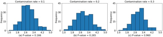 In determining the distance threshold, the current study set the type I error in order to be consistent with the study of Zou et al. [55]. Figure 8 depicts histograms of the calculated distances for different contamination rates. In the normality test (Anderson–Darling test), a - greater than the significance level (usually 0.05) indicated the distances had a normal distribution. The results of the normality test conducted in this study indicated that was an appropriate distance threshold.