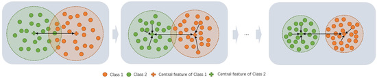 - The class space compression sub-module: In order to realize the recognition of unknown electromagnetic signals by separating the known and unknown electromagnetic signal category feature spaces more accurately, we introduced the center loss to compress the feature space of the known electromagnetic signal target, and expanded the feature space of the unknown electromagnetic signal target based on the well-established feature center of known categories. The feature space range of unknown electromagnetic signal categories can be improved by constraining the inter-class dispersion and intra-class compactness, which could be beneficial in improving the classification performance.