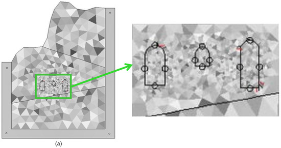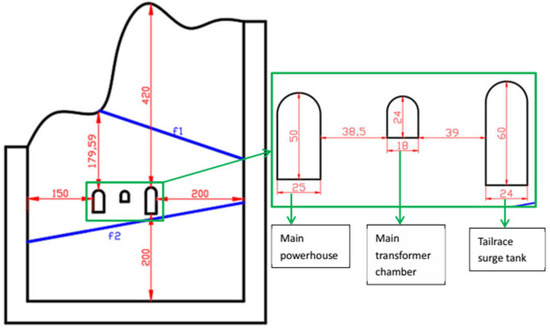 The section forms of the three caverns are round arch and straight wall, and the three caverns are arranged in parallel; the model can be simplified to a two-dimensional plane model. The section size of the MP cavern is 25 × 50 m (width × height), the section size of the MTC cavern is 18 × 24 m (width × height), and the section size of the TST cavern is 24 × 60 m (width × height).