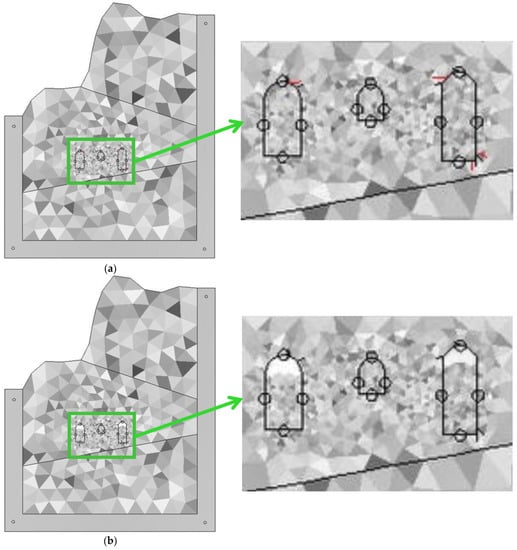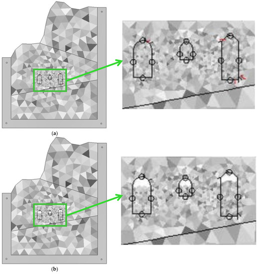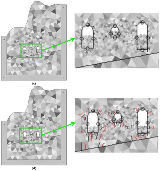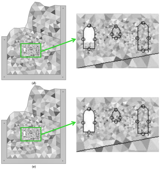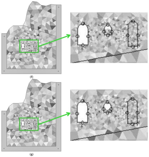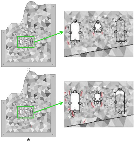From Figure 6, after the excavation began in Scheme 2, small cracks appeared in the surrounding rocks of the arch’s right side of the MP cavern and the arch’s left side and bottom floor’s lower right corner of the TST cavern, as shown in Figure 6a. With the progression in excavation, cracks did not further increase and expand after the end of the second step of excavation, as shown in Figure 6b–c. After the third step of excavation was over, the cracks around the cavern group gradually increased and expanded, long cracks appeared in the surrounding rocks of the three caverns’ bottom floor’s lower left and right corners, and the cracks also increased and expanded in the surrounding rocks of the arches of the MP cavern and the TST cavern. There were several fractures that appeared in fault f2, and one fracture was connected with the fracture in the bottom floor’s lower left corner in the SR of the TST cavern, as shown in Figure 6d. After the fourth step of excavation is over, the cracks in the surrounding rocks of the arch and right side of the MP cavern and the TST cavern further increased and expanded, as shown in Figure 6e.