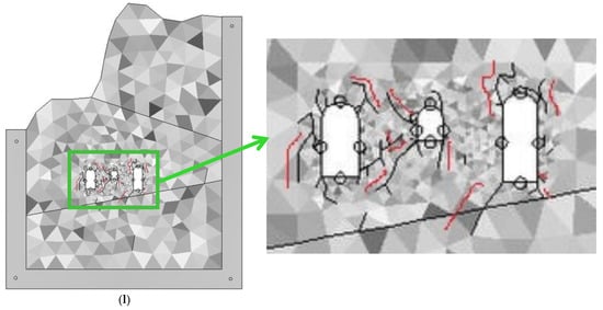 - The damage degree of surrounding rocks in the MTC cavern of Scheme 1 and Scheme 3 is relatively high. Scheme 1 has the largest crack propagation depth in the MTC cavern, as shown in Figure 5l. In Scheme 3, dense cracks appear on the left wall of the MTC cavern, forming a broken zone, as shown in Figure 11. Figure 9 shows the crack propagation depth of each part after the excavation of the MTC cavern in three schemes. According to the data in Figure 9, it can be seen that Scheme 1 has the largest crack propagation in the arch and bottom floor of the MTC cavern, and Scheme 3 has the largest crack propagation in the left and right side walls. Scheme 2 has the smallest crack propagation depth in the MTC cavern arch, the left wall, the right wall and the bottom floor. In conclusion, for the MTC cavern, Scheme 2 is the optimal scheme.