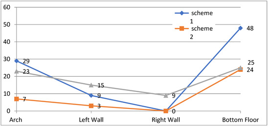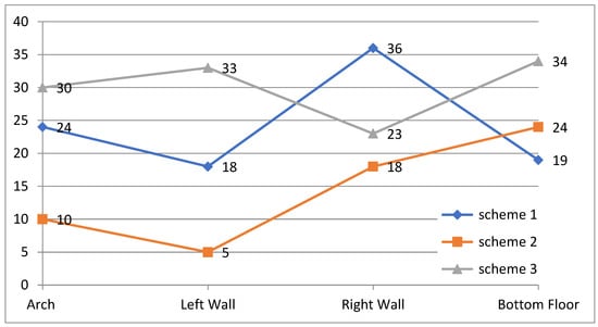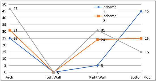- Schemed 2 and 3 of the TST cavern of rock damage are mainly concentrated on the right side of the arches, on the right side walls and on the bottom floors; the rock damage on the left side of the walls is not apparent, as shown in Figure 6e and Figure 7e, and the destruction of the TST cavern of Scheme 1 is mainly concentrated in the arch and bottom floor, as shown in Figure 5l. Comparing the crack area, it can be seen that Scheme 2 has the lowest degree of damage. Figure 10 shows the crack propagation depth of each part after the excavation of the TST cavern in three schemes. According to the data in Figure 10, Scheme 3 has the largest crack propagation depth in the arch and the right wall of the TST cavern, and Scheme 1 has the largest crack propagation depth in the bottom floor. The crack propagation depth of the left side wall is 0 in all three schemes. Scheme 1 has the smallest crack propagation depth in the arch, left side wall and right side wall of the TST cavern, while Scheme 3 has the smallest crack propagation depth in the bottom floor. In Scheme 2, although the propagation depth of SR of the arch, left and right side walls and bottom floor of the TST cavern are not the minimum, it does not appear to be the maximum either. In conclusion, for the TST cavern, Scheme 2 is the optimal scheme.