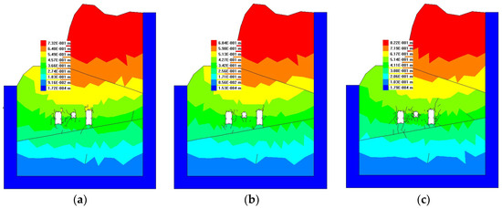 After the cavern group excavation was completed, the optimized DDARF program automatically measured the displacement contours of the SR of the cavern in three schemes, as shown in Figure 12a–c.