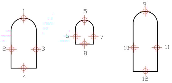 In order to obtain more accurate displacement data, at the arch, the left and right side walls and the bottom floor of each cavern, there are four key points set to measure the change in displacement in the process of excavation. The setting of measuring points is shown in Figure 13.