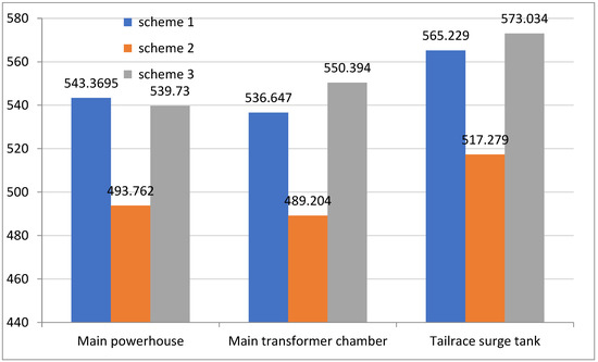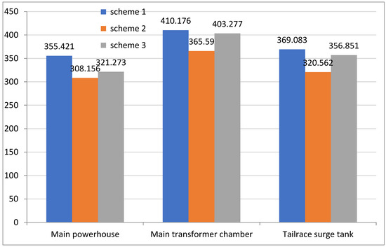 - In the vertical displacement of the bottom floor, Scheme 2 has the smallest vertical displacement of the MP cavern (308.156 mm), MTC cavern (365.59 mm) and TST cavern (320.562 mm), respectively. It can be concluded that from the vertical displacement of the bottom floor that Scheme 2 is the optimal scheme.