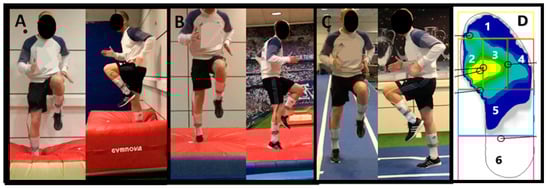 Participants were instructed to run on site on three mats with different hardnesses: soft, hard and air chamber. The Gymnova® soft mat (size 200 × 100 × 50 cm; weight 21 kg), with a density described by the manufacturer as 20 kg/m3, was composed of one piece of polyurethane foam and seemed to be commonly used to train jumping receptions (Figure 1A). The Gymnova® hard mat (size 400 × 200 × 50 cm; weight 78 kg), with a density described by the manufacturer as 25 kg/m3, was also composed of one piece of polyurethane foam and was commonly used to train exits from gymnastic tools (Figure 1B). The Airgym® (AG Industries BV Beek-Ubbergen, The Netherlands) Airtrack inflatable air chamber mat (size 600 × 150 × 20 cm; pressure 70 mbar) was used after checking the initial pressure with a manometer as recommended by the manufacturer (Figure 1C). Pressure measurements were registered in six different zones (Figure 1D) during the procedure.