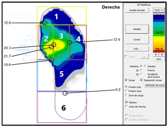 Outcome measurements were determined through the instrumented insole commercial software (Gebiomized®; GP MobilData; Munster, Germany). This software recorded data from 50 points and calculated the virtual pressure values between these points showing a measurement uniform distribution [4]. Once appropriate speed was reached in each test, we proceeded to record 10 steps with each foot. Using a graphic visual distribution, the most correct and symmetrical six consecutive steps were selected [21]. Collected outcome measurements were maximum force (Fmax) and peak pressures (PPs). Fmax comprised the maximum force (N) in the whole foot plantar region defined as a vector magnitude measured by applying an acceleration of 1 m/s² to a body weight of 1 kg. The total force value corresponded to the force received in the foot area of each sensor during the stimulus duration. PPs comprised forces’ pressures in a perpendicular direction per unit area. Indeed, six foot plantar areas were studied: toes (PP1), head of the first metatarsal (PP2), region of the second, third and fourth metatarsals (PP3), head of the fifth metatarsal (PP4), longitudinal arch of the foot (PP5), and calcaneus (PP6) [4], according to Figure 2.