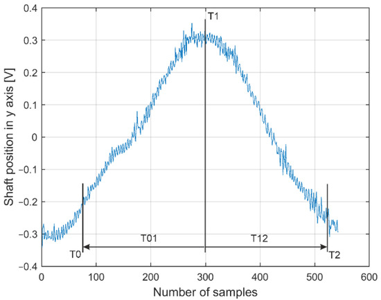 In the first step of analyzing the signals obtained from the experimental studies, the time interval T02, hereinafter referred to as a cycle, is determined for every single revolution. This interval corresponds to a full revolution of the shaft reduced on the outer parts of the intervals by several samples so that successive cycles do not overlap. Then the interval T02 is divided into two separate time intervals T01 and T12 (sample sets). Point T1 is common for both ranges and marks the moment when the shaft surface is farthest from the sensor face (Figure 1).