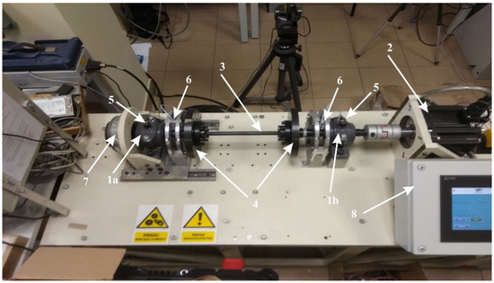 The proposed damage detection method was experimentally verified on the stand operated at the Bialystok University of Technology (Figure 2 and Table 2). The main element of the test stand is the rotor mounted on two ball bearings (1a–on the brake side and 1b–on the drive side), driven by an electric motor (2) with adjustable speed (up to 2000 rpm). The rotor consists of three parts: the middle part is a replaceable shaft (3), and the outer parts are the drive shaft and the braking shaft supported on the bearings. The shafts are connected into one rotor using conical fits and flanges with bolts ensuring, on the one hand, the axial symmetry of the rotor and, on the other, quick and simple reconfiguration of the shafts. Mass discs (4) are attached to the outer shafts. At the shaft’s end, an electromagnetic brake (7) enables the torsional load introduction. The radial positions of the shaft near both bearings are measured by eddy current sensors placed in the horizontal and vertical planes, two at each bearing. Variants of the bearing damage were implemented in the support closer to the drive (1b).