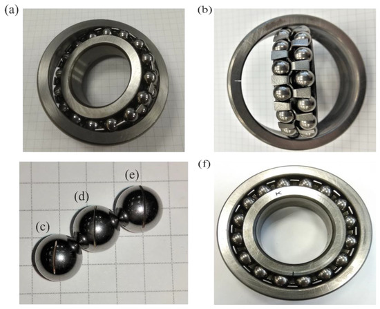 Ball bearing SKF 1207K: (a) undamaged; (b) with cut outer race; with the cut ball at the depthof: (c) 1 mm; (d) 2 mm; (e) 3 mm; (f) with cut inner race.