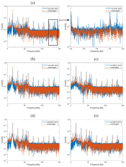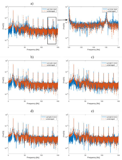The FFT analysis of the recorded shaft displacement signal influenced by the vibration signal coming from bearing (brake side) SKF 1207K: (a) with cut inner race; (b) with cut outer race; with the cut ball at the depth of: (c) 1 mm; (d) 2 mm; (e) 3 mm.