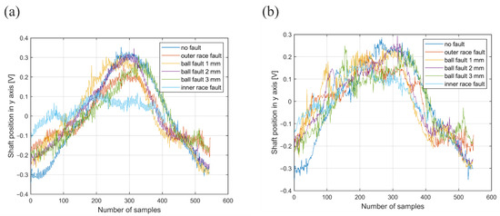 The bearings were tested in five configurations: undamaged, with cut outer and inner race, with the cut ball at a depth of 1, 2, and 3 mm and width 0.3 mm. The registration of the diagnostic signals was implemented by eddy current sensors, positioned radially to the rotating shaft in the vertical Y and horizontal X axes (two sensors at each bearing).