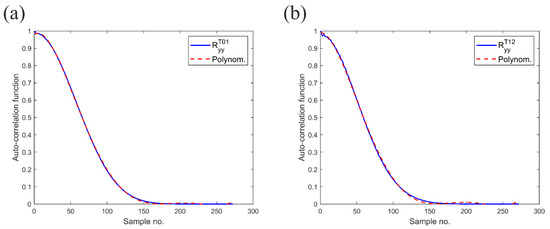 Examples of auto-correlation functions and their fifth-order polynomial approximations in two observation zones of the selected cycle of the rotor displacement signal (from Figure 1) are shown in Figure 7.
