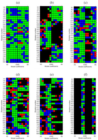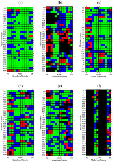 First, a damage map was created for the undamaged bearing. The diagnostic thresholds set for it were the reference thresholds used for damaged bearings. The damage map contains 30 rows marked with numbers of randomly selected cycles and 12 columns, which consist of coefficients of 5th-order polynomials (six coefficients each) for the numerator and denominator of the model. Comparing the model results for different damage variants is possible, using only the same degree of the matching polynomial. The numbers of the damaged bearings cycles were the same as for the previously randomly selected cycles of the undamaged bearing.