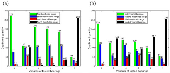 Figure 10 presents a quantitative summary of all tested bearing variants at the rotor speed of 900 rpm (Figure 10a-bearing closer to the brake, 10b-bearing closer to the drive). Bearing variants are marked on the horizontal axis (a–undamaged bearing; b–with a damaged outer race; with the cut ball at the depth of: c–1 mm; d–2 mm; e–3 mm; f–with a damaged inner race), and on the vertical axis the number occurrences of a given color. It can be seen in both types of figures that the undamaged variant significantly dominates over the others in the case of the threshold not exceeding µ ± σ (green), while the values of the thresholds indicating damage have the lowest. It can also be noticed that in the case of bearing balls with cuts 1, 2 and 3 mm deep, the threshold µ ± σ decreases (green) while the threshold µ ± 2σ increases (black). High values of black and red colors are visible for the variant of the bearing’s outer race damage, as a result of which, during the rotation of the shaft, all of the balls in the bearing hit the discontinuity of the race, generating vibrations. The highest values of black color can be seen for the bearing with the cut inner race. In this case, balls more frequently hit the cut point on the inner race than in the outer race.